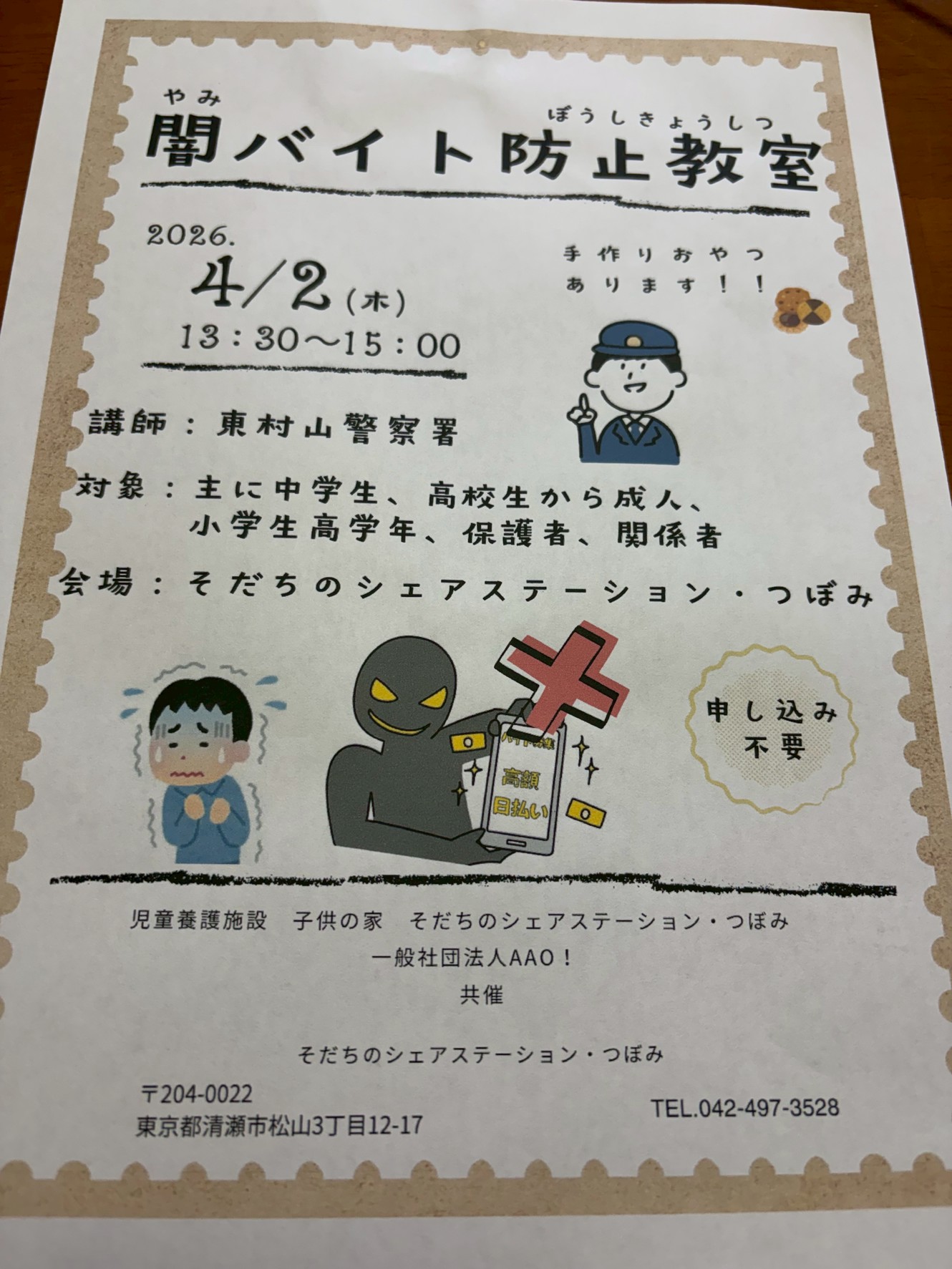 市内の児童施設「つぼみ」と共催で東村山警察の方をお呼びして防犯教室を開きました。