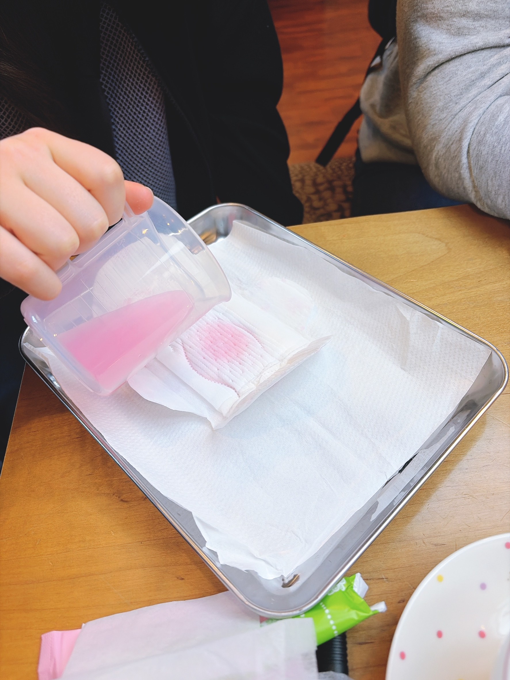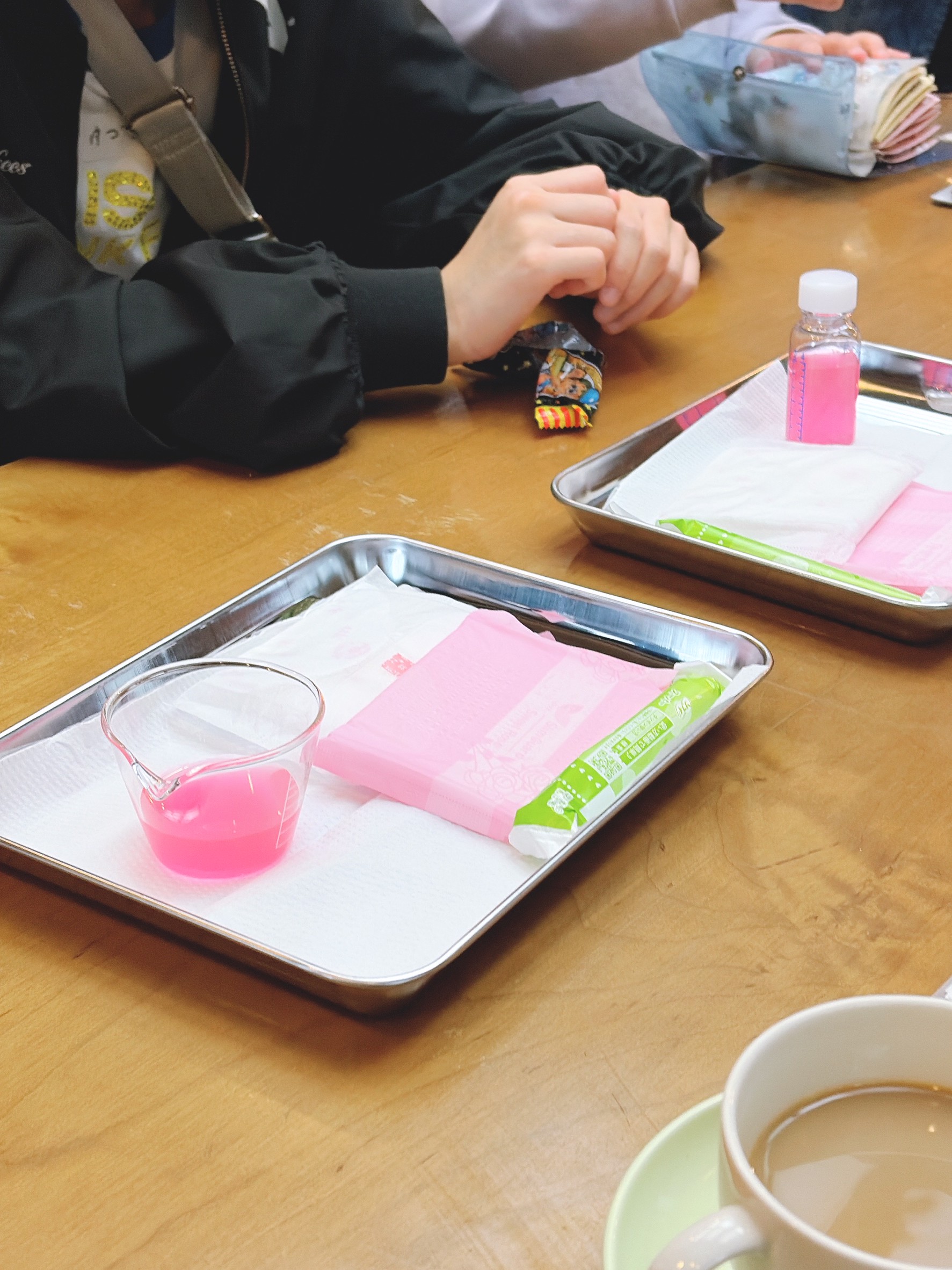 ナプキンの吸水実験や、ショーツを実際に見て貰ったりしました。